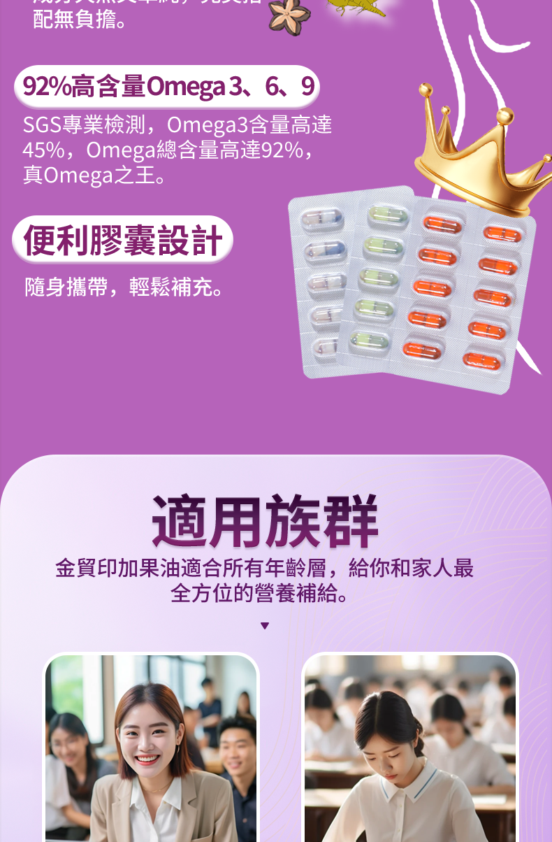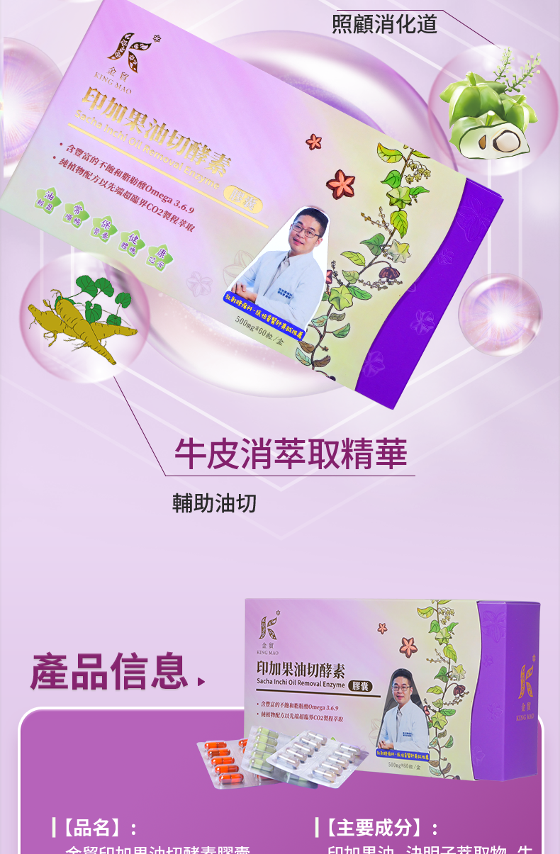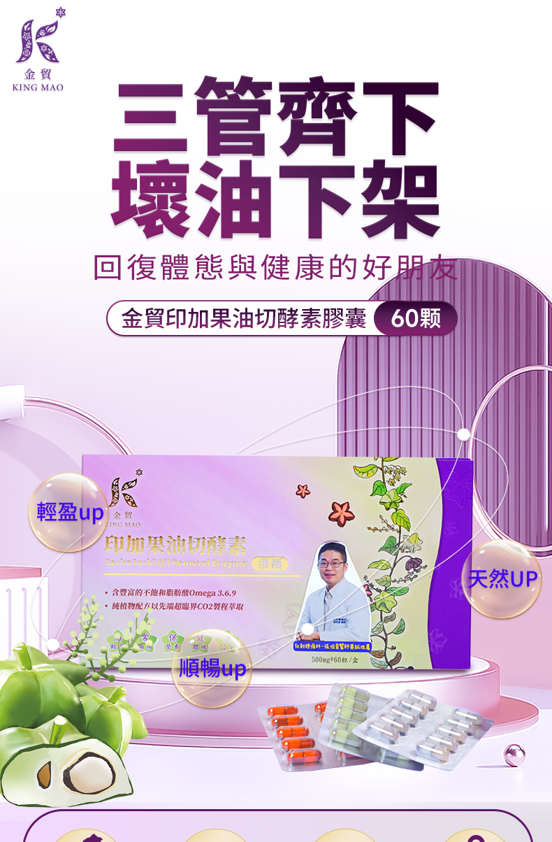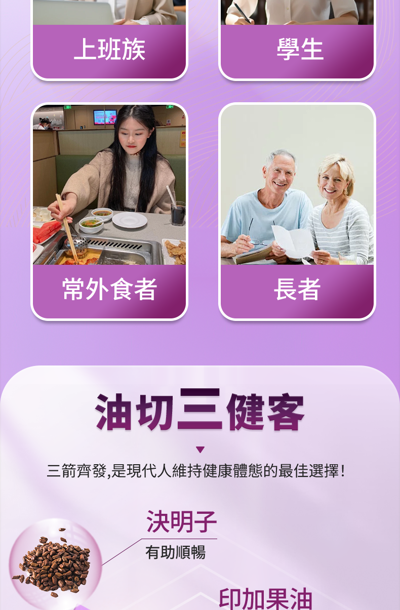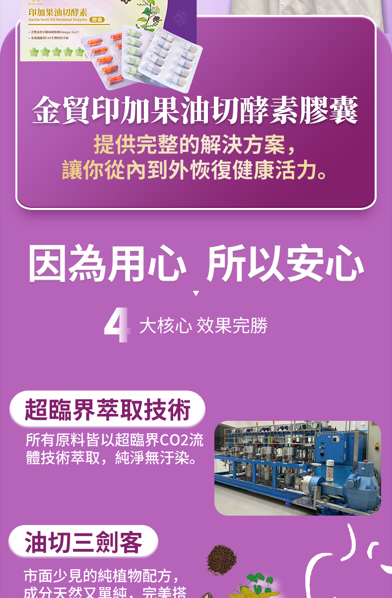 以超臨界高壓CO2氣體低溫萃取出的頂級印加果油再搭配、決明子、牛皮消萃取出的精華,組合成油切三健客。順腸解密讓您輕盈綻放自信的光采!